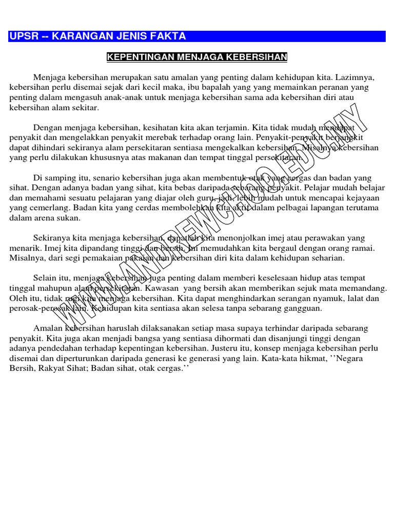 Monday 7 September 2015. UPSR -- KARANGAN JENIS FAKTA KEPENTINGAN MENJAGA KEBERSIHAN Menjaga kebersihan merupakan satu amalan yang penting dalam kehidupan kita.